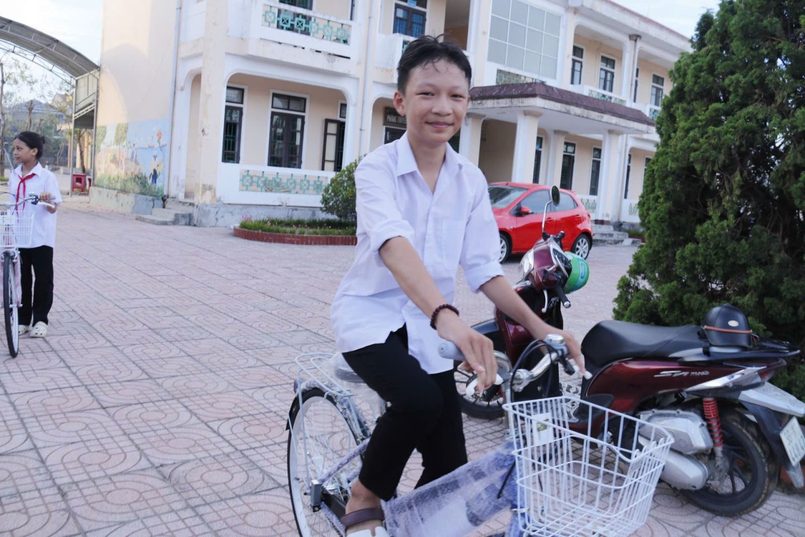 Hình ảnh vui mừng của các em học sinh khi được nhận xe đạp mới.