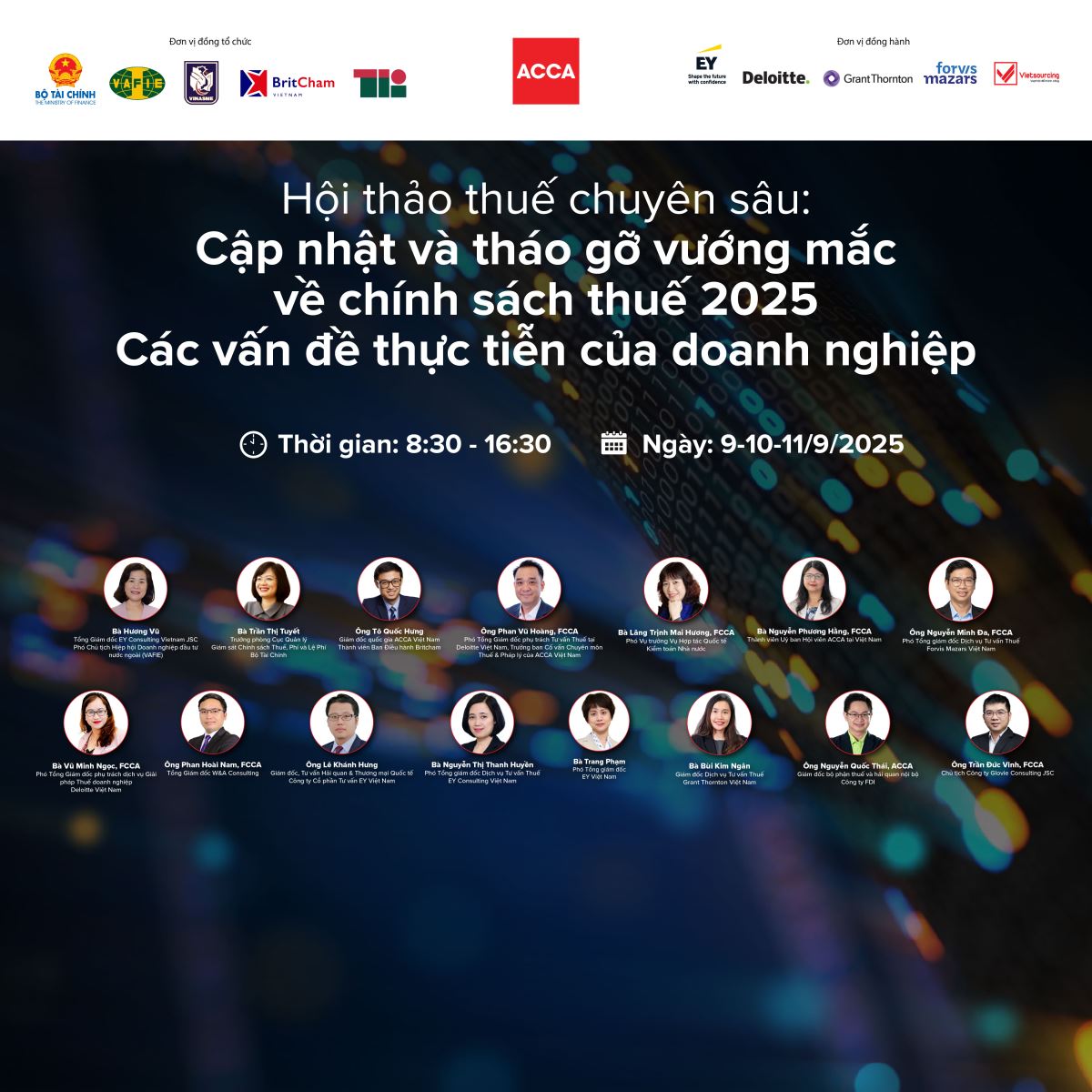 Hội thảo quy tụ hơn 12 chuyên gia hàng đầu trong lĩnh vực thuế – tài chính – kinh doanh, là các nhà lãnh đạo đến từ Bộ Tài chính, Kiểm toán Nhà nước cùng đại diện các hiệp hội và công ty tư vấn quốc tế như VAFIE, Deloitte, EY, Grant Thornton, Forvis Mazars. Trong đó, đáng chú ý có bà Hương Vũ – Phó Chủ tịch VAFIE, Tổng Giám đốc EY Consulting Vietnam; ông Phan Vũ Hoàng, FCCA – Phó Tổng giám đốc Deloitte Việt Nam, Trưởng ban Chuyên môn Thuế & Pháp lý ACCA Việt Nam; bà Lăng Trịnh Mai Hương, FCCA – Phó Vụ trưởng Vụ Hợp tác Quốc tế, Kiểm toán Nhà nước; ông Nguyễn Minh Đa, FCCA – Phó Tổng giám đốc Tư vấn Thuế, Forvis Mazars Việt Nam; bà Bùi Kim Ngân – Giám đốc Tư vấn Thuế, Grant Thornton Việt Nam.